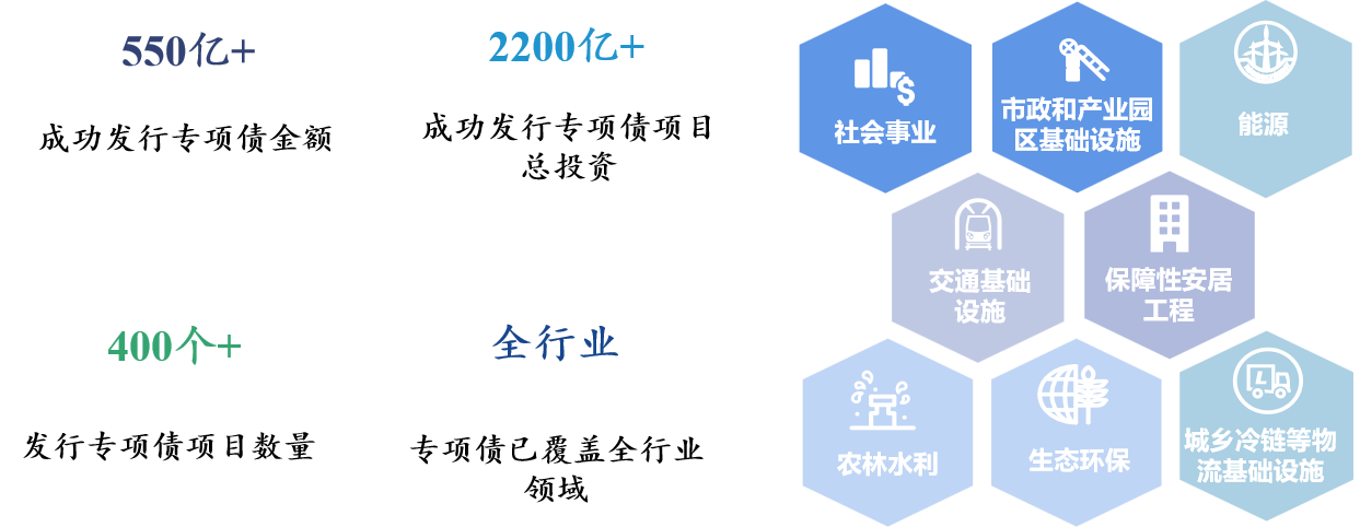 专项债作为政府稳基建、稳投资的重要工具,随着近年来政策的不断推进,对地区经济发展的影响力持续扩大。永业行紧抓政策、系统谋划,助力各地重大项目落地。截至2022年7月底,永业行已助力湖北省、海南省、安徽省等地区成功发行专项债累计超550亿元,策划专项债项目的总投资超2200亿元。实现全行业覆盖,包括市政和产业园区基础设施、交通基础设施、社会事业、保障性安居工程、农林水利、生态环保、农林水利、能源、城乡冷链等物流基础设施等各个领域。